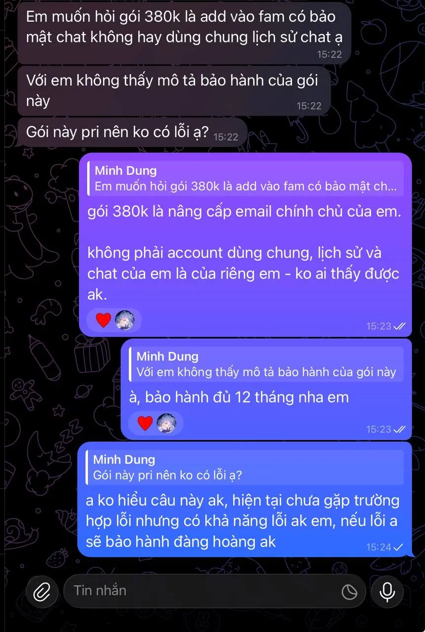 - Gói Nâng Cấp Email Google Chính Chủ / 380k / 12 tháng => tức là người mua sẽ gửi mình email Google (nên dùng mail phụ và chỉ cần gửi mỗi email – không cần pass), mình sẽ gửi invite đến mail đó vào family để mình share gói => người mua check mail rồi Accept invite sẽ dùng được gói Gemini Pro.